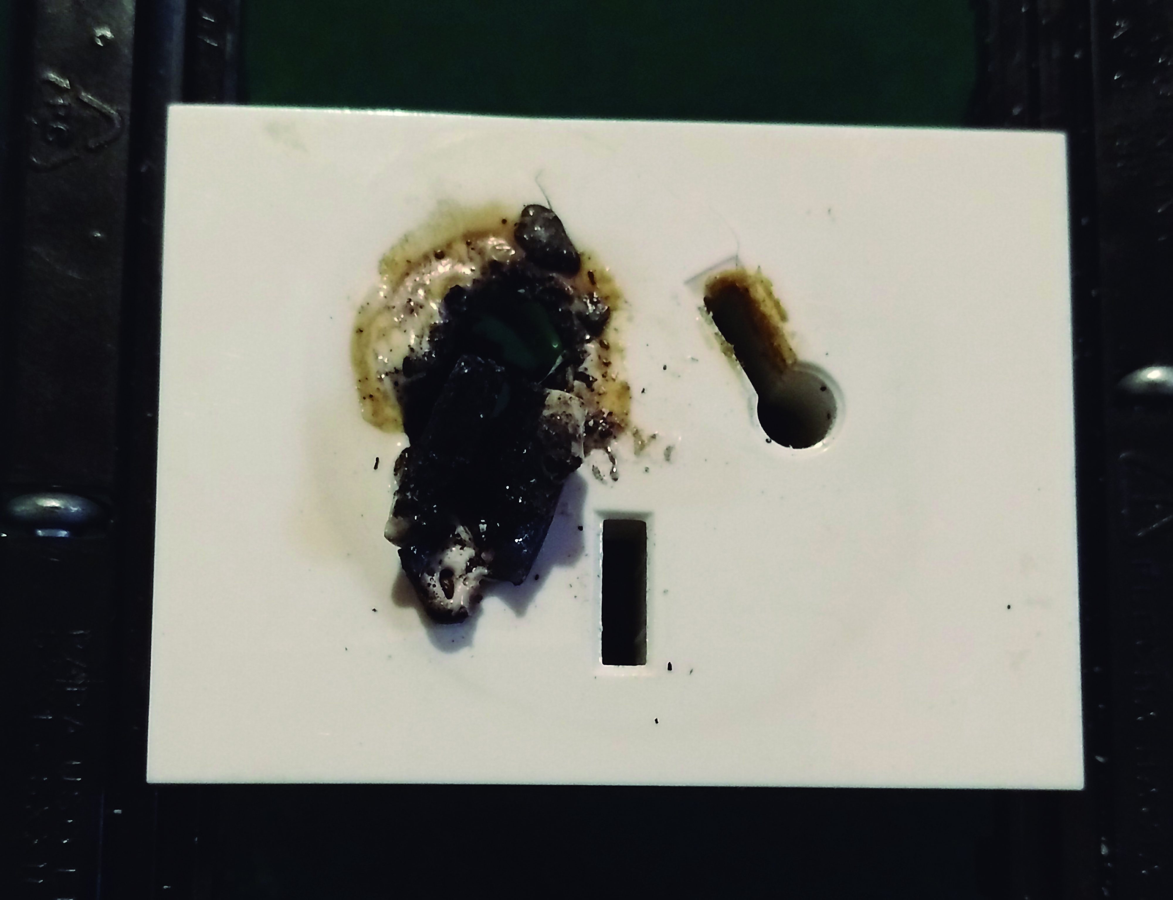 La figura 1 muestra una de las tantas causas de incendio de origen eléctrico en derredor del tomacorrientes, debidas a falsos contactos por bornes no lo suficientemente apretados, empalmes flojos y/o penetración incompleta de las espigas macho de la ficha. Nótese que la instalación del tomacorrientes fue hecha “de apuro” (quedaron en el chasis los tornillos, cuyas cabezas son visibles en la foto) y que el posible incendio no tuvo lugar merced a la calidad del material no propagante de la llama empleado.