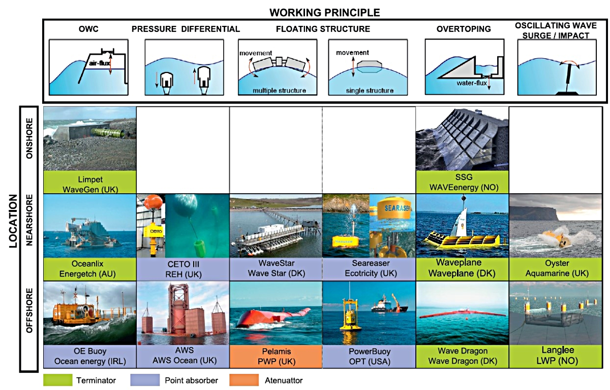 Existen múltiples enfoques para convertir la energía del oleaje en electricidad. En general, los WEC se clasifican según su ubicación (costa, mar adentro), su principio de operación y su forma de interactuar con las olas, como se muestra en la figura 1. Una clasificación común distingue tres tipos principales: