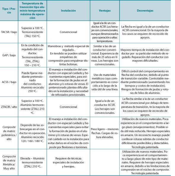 Del diagnóstico anterior hay un concepto claro como es considerarlo una solución ante alternativas casi imposibles, o al menos de largo plazo de implantación, basando la decisión técnica en que el conjunto es capaz de ofrecer un aumento de capacidad de transporte suficiente con una fiabilidad garantizada y unos costos de explotación mejores que los reconocidos si la actividad fuera regulada. La valoración de pérdidas debe realizarse entre distintas alternativas constructivas para los diferentes conductores existentes en el mercado. Debe abandonarse la idea de que el conductor es una pieza independiente y hablar del sistema de conducción de la electricidad, conductor, grapas, accesorios, amarres, y siempre los útiles especialmente diseñados y optimizados para este material. |