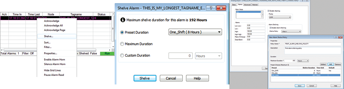 Figura 8. Se pueden crear hasta veinte políticas de Alarm Shelving, con diferentes tiempos según las distintas áreas de una planta industrial los operadores pueden elegir qué alarmas dejar de lado, directamente desde el Alarm Summary;