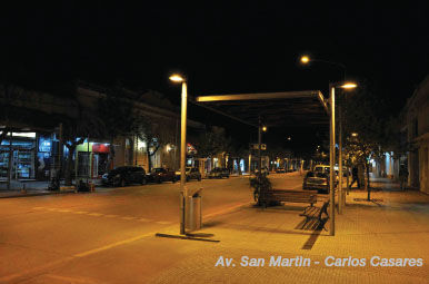El proyecto de refuncionalización de la avenida San Martín profundiza las ideas del anteproyecto municipal, recoge las observaciones del Jurado y expresa los aportes realizados por los funcionarios municipales al mismo. El ganador ha sido el Estudio PBL de Trenque Lauquen, presidido por los arquitectos Carlos Pellegrini y Pedro Llamedo. En el plano de la vialidad peatonal se producen importantes cambios respecto a la realidad física actual, intentando restituir el equilibrio perdido entre vehículos a motor y peatones. El proyecto resuelve un nuevo espacio en el área crítica donde ambos se encuentran: el cruce de calles. Se definió con precisión la zona área de cruce, donde el peatón puede ejercer su prioridad de paso, contando para ello con una zona ampliada de paso peatonal, ubicada en posición de garantizar la continuidad de la vialidad peatonal. Además, se produjo en el área una drástica limpieza de elementos existentes en el espacio público como marquesinas, kioscos y carteles; un reemplazo total de luminarias peatonales y vehiculares. Para iluminar todo el área de encuentro se eligieron luminarias marca Strand modelo RS150 con lámparas de sodio de 100 W en zona peatonal y modelo SR660 con lámparas de sodio de 150 W para la calzada.