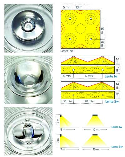Dado que hoy en día la gran mayoría de los equipos de iluminación de emergencia utilizan como fuente luminosa el led, esto brinda la oportunidad del uso de lentes para el redireccionamiento de la luz hacia la zona que lo necesite y así garantizar la homogeneidad de la iluminación y un mayor alcance. De esta manera permite realizar el diseño específico de la lente, acorde a cada necesidad. Como ejemplos de aplicación de lentes, podemos señalar los siguientes: