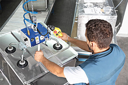 VacuMaster es un elevador de vacío de estructura modular. Los diversos módulos básicos, elementos de manejo, raíl de carga y placas de ventosa, permiten una configuración personalizada a cada caso. La fuerza de aspiración necesaria proviene del generador de vacío y se transmite a la pieza mediante las placas de ventosa.