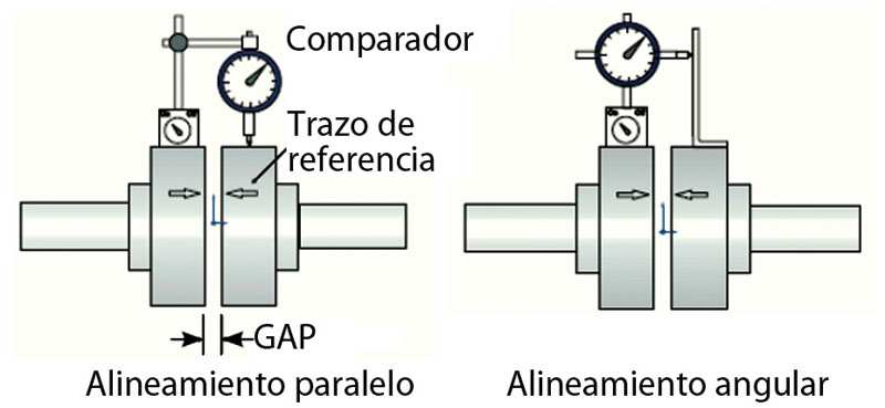 Resulta de vital importancia para el funcionamiento y la vida útil del conjunto que el acoplamiento esté perfectamente alineado. Para realizar esta tarea se debe recurrir a un instrumento llamado “comparador”, el cual puede ser mecánico o bien electrónico mediante una emisión de láser. La figura 4 muestra la utilización de uno mecánico, teniendo en cuenta las dos dimensiones verificables. La figura 5 corresponde a un comparador mecánico con pie magnético que permite la fijación.
