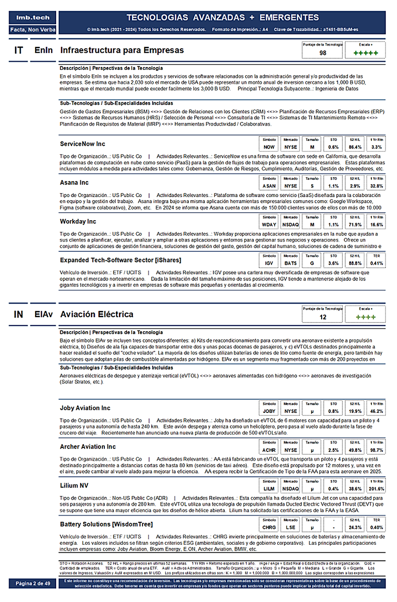 El informe de tecnologías avanzadas y emergentes (Informe T [A+E]) incluye una descripción de cada una de las tecnologías consideradas, como así también un detalle de las subespecialidades incluidas. Se hace también mención de hasta cuatro empresas y/o fondos de inversión que actúan en cada una de esas tecnologías y que son considerados como estadísticamente representativos.