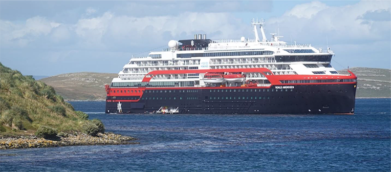 Figura 1. El buque MS Roald Amundsen “fondeado” en la rada de entrada del paraje West Point, muy cercano a la isla Gran Malvina. (Para mantener su posición, este buque no usa sus anclas, sino su sistema de posicionamiento dinámico).