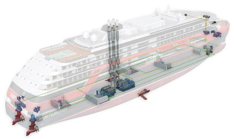 El MS Roald Amundsen [2] es, supuestamente, el primer barco crucero del mundo en adoptar el denominado sistema de propulsión híbrida, cuyo principal objetivo es reducir el consumo de combustible y, consecuentemente, minimizar la huella de carbono derivada de las operaciones.