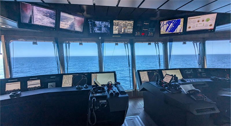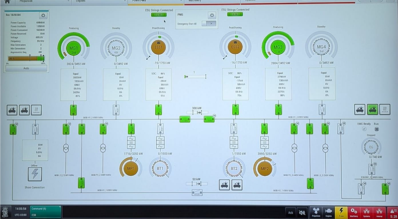Figura 4. Puente de mando y esquema de distribución eléctrica. Pantalla para la visualización de la generación eléctrica y de los consumos de potencia. MG1... MG4, generadores; ESS1 y ESS2, baterías; MP1 y MP2, impulsores principales; BT1 y BT2, impulsores laterales de proa.
