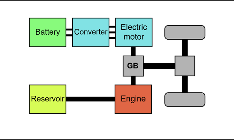El Toyota Prius es posiblemente el vehículo híbrido más difundido en los mercados mundiales. Si se analiza el esquema de transmisión de este automóvil, se pueden identificar como mínimo dos características fundamentales: a) una unidad de acople mecánico que puede recibir potencia tanto del motor de combustión interna como del motor eléctrico, y b) un mecanismo de recuperación de la energía cinética del vehículo.