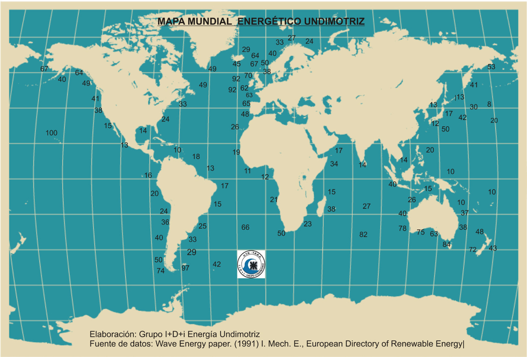 Figura 2: Mapa mundial con valores de potencia undimotriz en kilowatts por metro de frente de ola indicados por región. (Pelissero et al., 2011)
