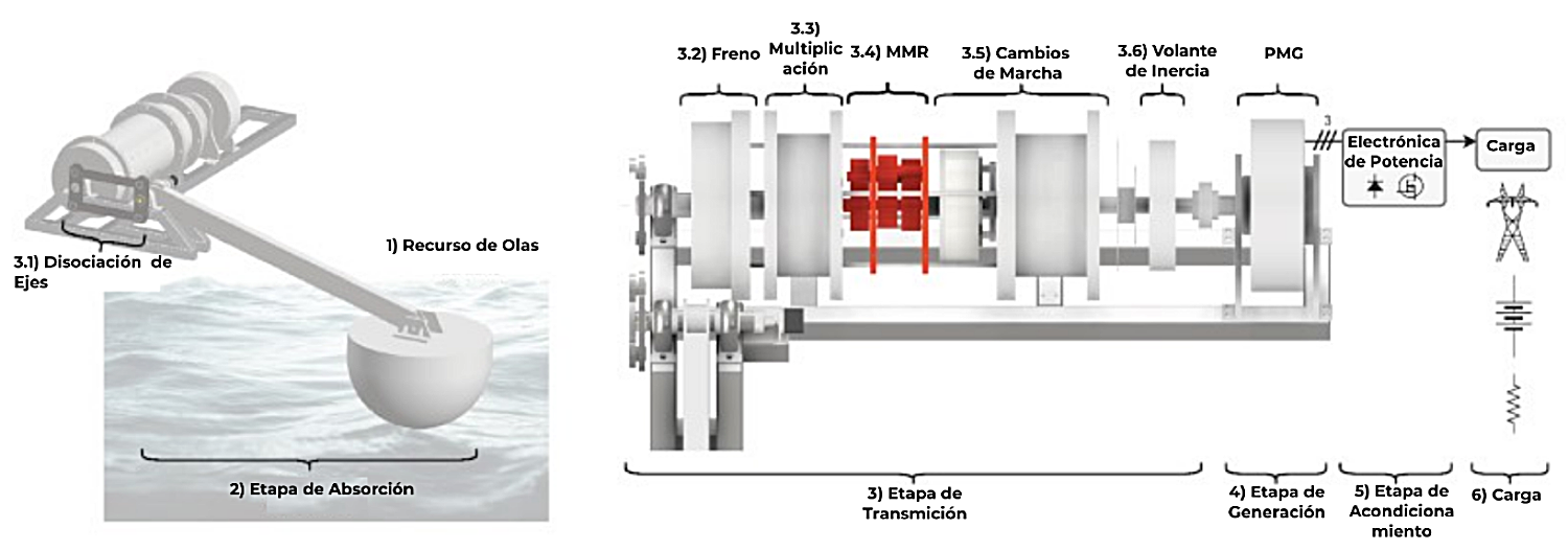Como núcleo local, de la ciudad de Mar del Plata, el Laboratorio de Instrumentación y Control (LIC) del ICYTE (CONICET-UNMDP) cumple un rol central en este desarrollo. En el LIC desde hace varios años se viene trabajando en prototipos de convertidores de olas de pequeña escala, acumulando experiencia en sistemas mecánicos de extracción de energía. Fruto de esas investigaciones, el diseño adoptado para el prototipo de Mar del Plata incorpora un sistema de PTO mecánico innovador, que incluye una transmisión por engranajes y un rectificador mecánico de movimiento oscilatorio (MMR, por sus siglas en inglés). En esencia, la boya captadora mueve un eje alternativo (vaivén) que se convierte mediante un mecanismo de trinquete o embragues de un sentido en un giro unidireccional continuo, el cual acciona un generador eléctrico. Este concepto de rectificación mecánica del movimiento de las olas ha sido explorado internacionalmente por su capacidad de incrementar la eficiencia de conversión: por ejemplo, prototipos MMR en su PTO lograron rendimientos mecánicos superiores al 60% en ensayos controlados. En nuestro país, el equipo del LIC ha construido un banco de pruebas para ensayar estos sistemas PTO bajo cargas simuladas de oleaje, como se muestra en la figura 3. Los ensayos de laboratorio demostraron la factibilidad de la conversión mecánica y permitieron optimizar componentes como embragues unidireccionales y el tren de engranajes multiplicadores. El siguiente paso es validar el desempeño del convertidor en un entorno relevante de campo (el mar). Para ello, se busca construir el prototipo a escala real (en torno a 5-10 kW de potencia estimada). Este prototipo se proyecta instalar inicialmente en una estructura fija en la escollera norte de Mar del Plata, donde podría operarse de forma experimental recolectando datos de potencia generada, esfuerzos estructurales, comportamiento en diferentes estados de mar y eficiencia del PTO en condiciones reales. La elección de la escollera (un entorno semiprotegido) busca facilitar el acceso para montaje, mantenimiento y seguridad, al mismo tiempo que expone al dispositivo a oleaje representativo moderado. De validarse con éxito, es posible escalar gradualmente el sistema y evaluar su desempeño en ubicaciones más expuestas y con mayor energía (por ejemplo, mar adentro con anclaje flotante).