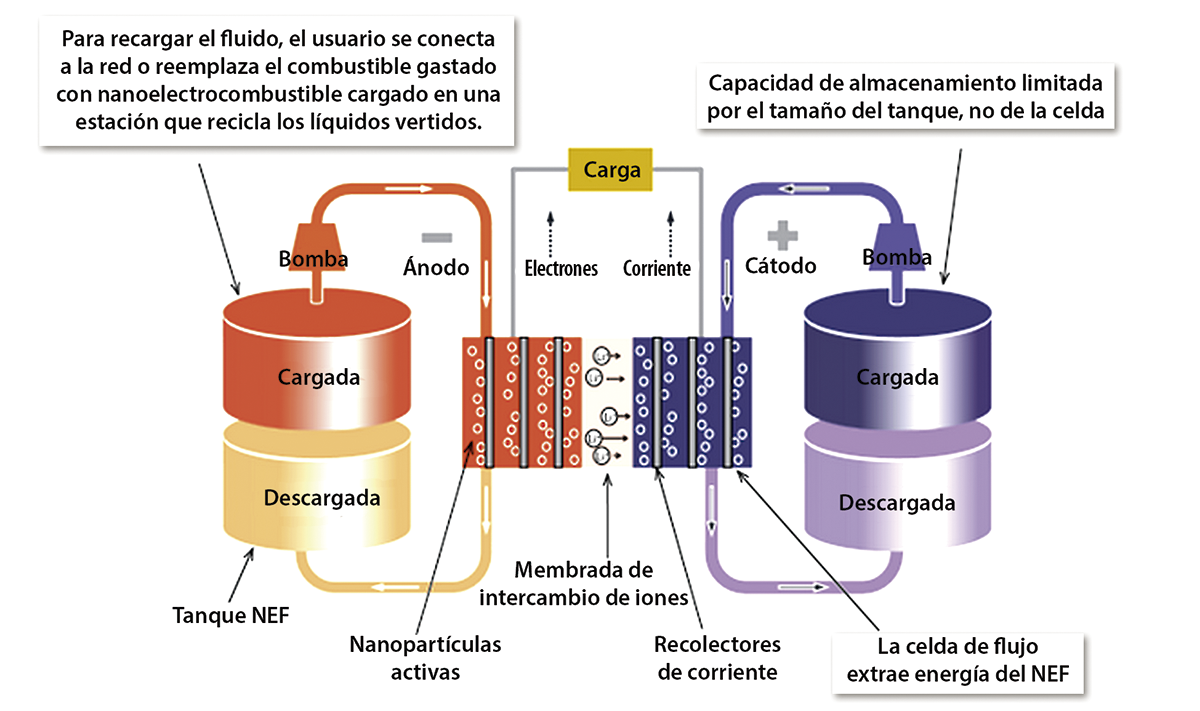 Como se muestra en la figura 3, los electrolitos catódicos y anódicos se almacenan externamente a la batería y circulan a través del reactor según sea necesario, proporcionando potencia y capacidad de almacenamiento de energía. Las principales limitaciones de las baterías de flujo tradicionales a base de electrolito en aplicaciones de transporte son las densidades de baja energía (40-80 Wh/L) debido a la solubilidad limitada de las sales redox. En lugar de sales redox, la tecnología NEF utiliza dispersiones estables de nanomateriales de cátodos sólidos y ánodo en electrolitos acuosos. La energía eléctrica se almacena en nanopartículas redox, que en modo de descarga sufren una reacción electroquímica espontánea dentro de la pila de células de flujo con NEF catódica, siendo reducida, y NEF anódica, siendo oxidada. La diferencia entre los potenciales electroquímicos para reacciones catódicas y anódicas redox define el potencial celular. En condiciones de reposo de estado estacionario, los NEF catódicos y anódicos pueden almacenarse por separado del dispositivo.