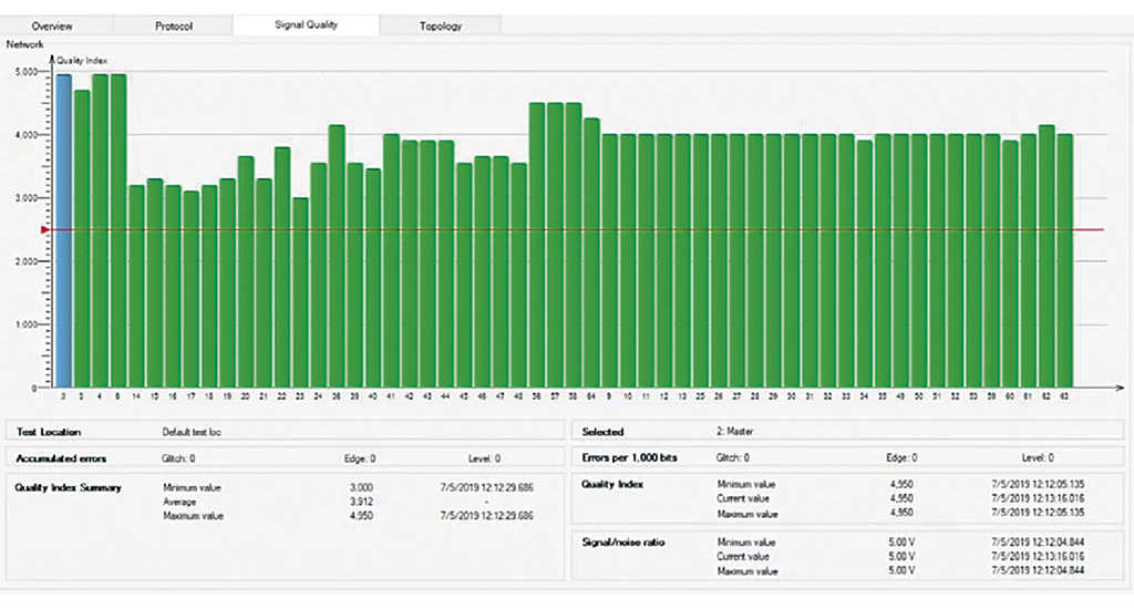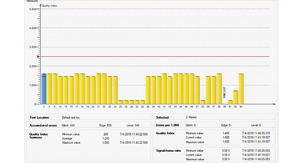 Pero el segundo segmento seguía con problemas. Nuevamente, mediante el téster de cable se verificó la existencia de, por lo menos, un cortocircuito entre los hilos de datos ‘A’ y ‘B’ y la malla del cable PROFIBUS DP, teóricamente en la segunda mitad del segmento. Se comenzó a testear el segmento desde el repetidor sin el PLC, con un téster de calidad en línea (PB-Q ONE) configurada en modo simulador de maestro. De esta forma, el equipo permitió calcular la topología de la red y determinar la ubicación del o de los cortos.