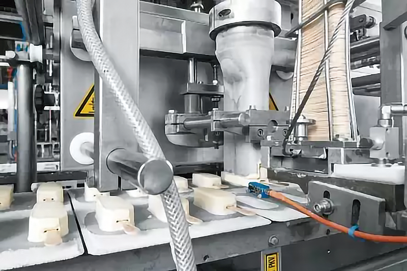 Posicionamiento perfecto: el núcleo de los helados Magnum sale de la extrusora a gran velocidad. Durante el proceso de extrusión, se inserta el palillo.