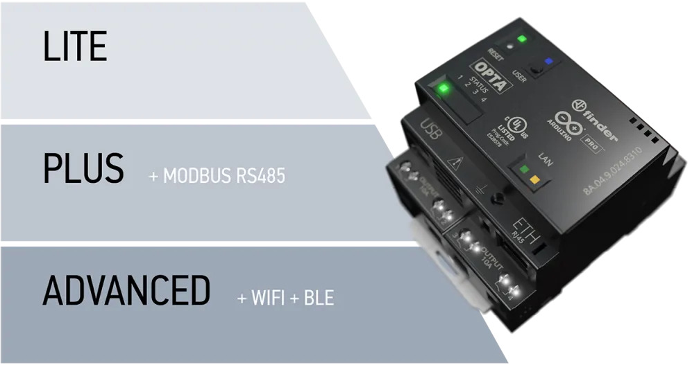 • Opta Lite, con conectividad Ethernet o ModBus TCP/IP y puerto de programación USB-C;