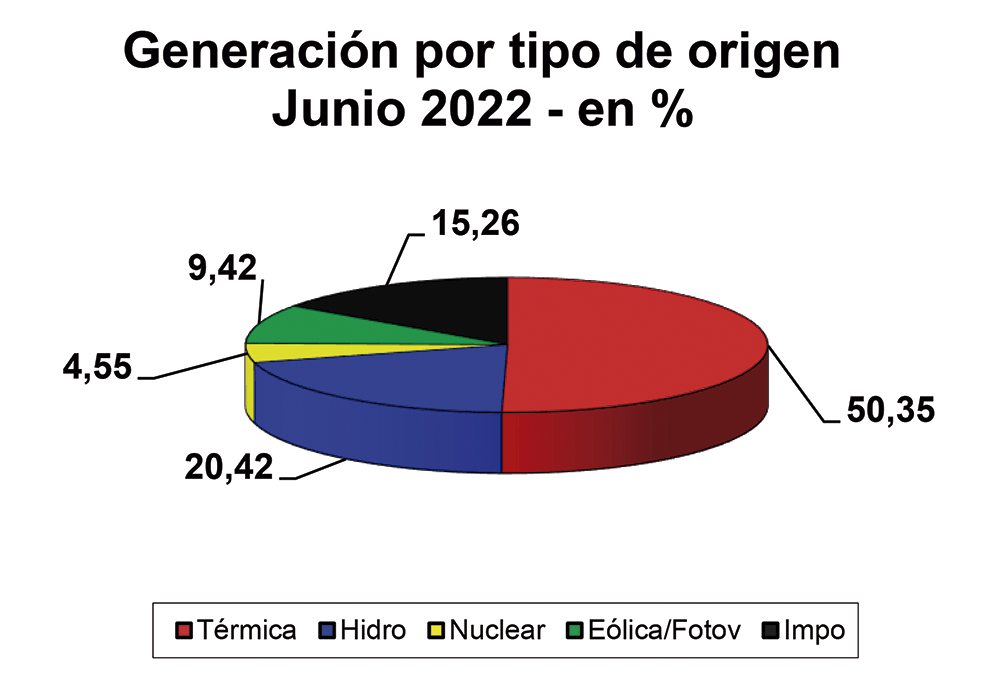 Así, en junio siguió liderando ampliamente la generación térmica con un aporte de producción de 50,35% de los requerimientos. Por otra parte, las centrales hidroeléctricas aportaron el 20,42% de la demanda, las nucleares proveyeron un 4,55%, y las generadoras de fuentes alternativas un 9,42% del total. Por otra parte, la importación representó el 15,26% de la demanda.