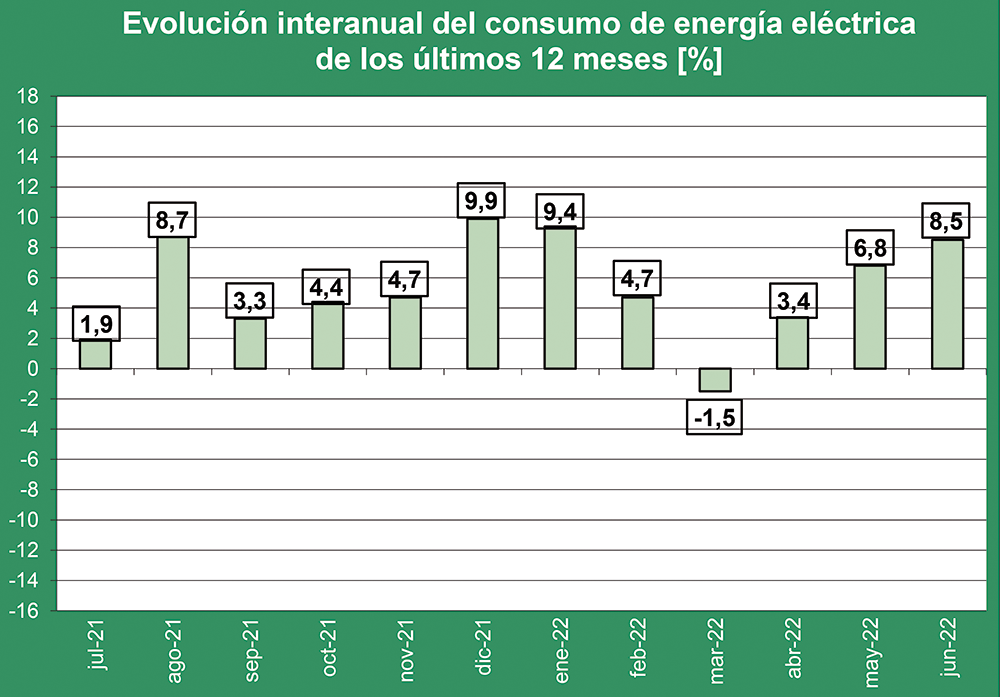 En junio de 2022, la demanda neta total del mercado eléctrico mayorista fue de 13.073,8 GWh, un 8,5% más que en el mismo mes en 2021. Asimismo, se registró un crecimiento intermensual del 11,4% respecto de mayo de 2022. La potencia máxima alcanzó los 26.062 MW el día 22 a las 20:32, elevada, pero lejos de los 28.231 MW de enero de 2022, récord histórico.