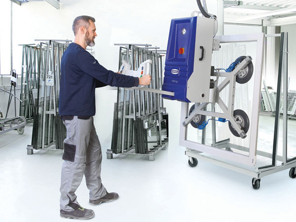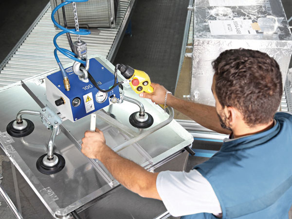 Con fines de seguridad, el raíl de carga de aluminio sirve al mismo tiempo de acumulador de vacío. Para el movimiento de elevación se precisa un polipasto, que se ofrece al igual que el sistema de grúa adecuado.