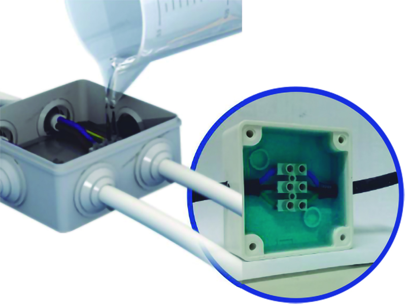 Con el gel, de color azul transparente, se rellenan las cajas de derivación, y también sirve para aislar placas y componentes electrónicos, redes de datos y telecomunicaciones. La composición está preparada para aislar conexiones eléctricas de 0,6 a 1 kV. El producto no requiere deshacer la instalación existente, y una vez colocado según las instrucciones de uso, no impide que se pueda volver a acceder a todos los componentes involucrados. Si se utiliza el envolvente adecuado, aumenta el grado de estanqueidad de la conexión.