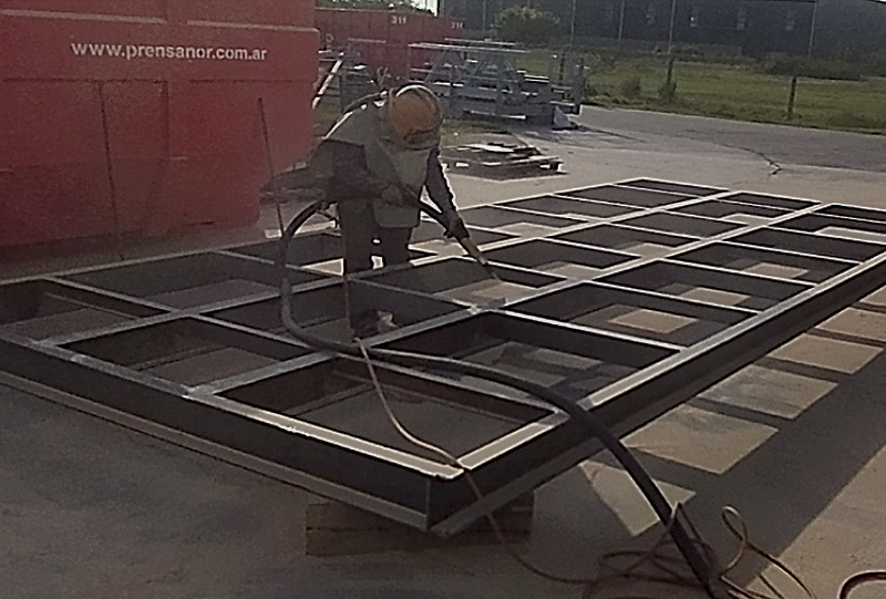 A continuación, el proceso que se aplica a todas las partes externas y expuestas al ambiente. Primero se lleva a cabo la preparación de superficies para el pintado: se eliminan completamente el aceite, grasa en polvo, las sales solubles, las grasas, óxido y los restos de distinta coloración de capas de laminación y suciedad en general, lavando con soluciones detersivas y con un enjuague con agua dulce a presión. Los excesos de cordones de soldadura se eliminan utilizando amoladora con discos abrasivos. Luego del secado, se somete a un chorro abrasivo (arenado) a grado SSPC-SP-6.