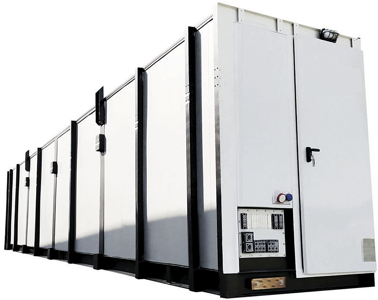 Los equipos instalados en la sala eléctrica modular se aterrizan a la estructura base, conectados en dos extremos opuestos una de la otra. Las placas internas inferiores de cobre son de 80 x 5 mm, de 60 x 10 o de 300 mm de largo.