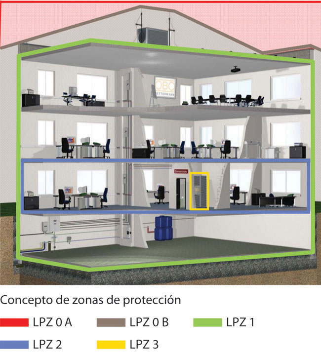 • LPZ 1. Sin rayos directos, CE amortiguado (protección básica)