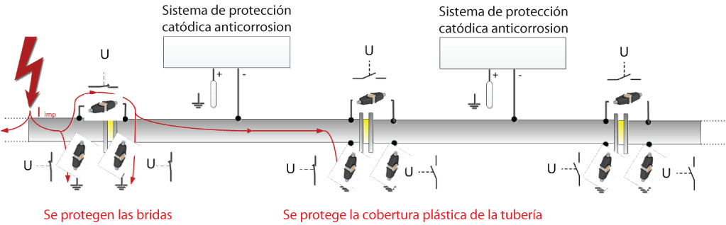 Dentro del amplio espectro de soluciones, se destacan productos como las vías de chispas en cañerías (figura 8). En estado normal, la llave está abierta, pero cuando se produce la sobretensión, cierra y equipotencializa las estructuras del caño, disminuyendo la diferencia de tensión entre tramos de tubería. Si no existiera la protección, se produciría un arco eléctrico, una chispa dañina si la tubería transporta gas, por ejemplo. Asimismo, sobresalen la gama de barras equipotenciales, incluso para zonas clasificadas y para 100 kA, y el sistema de puesta a tierra vehicular que permite verificar la equipotencialización antes de, por ejemplo, descargar combustibles o cereales.
