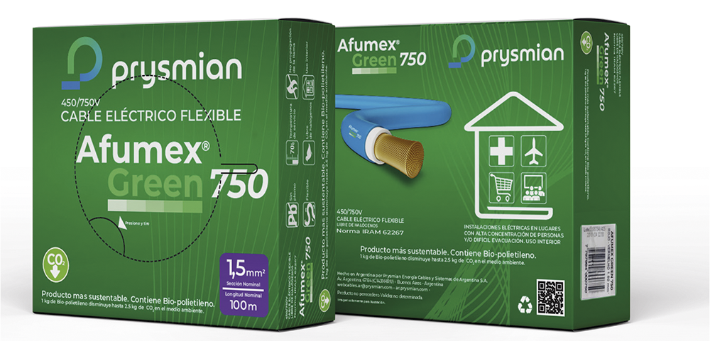 Los nuevos cables Afumex® Green 750, con clase de tensión 450/750V, fabricados en secciones de 1,5 a 70 mm2, cumplen con la norma IRAM 62267 están recomendados para todo tipo de instalaciones eléctricas, pueden instalarse en conductos de edificios residenciales, comerciales o industriales. Su presentación en caja para las secciones de 1,5 a 6 mm2 permiten una fácil instalación y posterior guardado en caso de ser necesario.