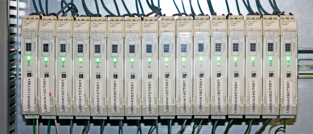 Figura 3. Una aplicación con alta densidad de transmisores de temperatura montado en riel DINEstas carcasas se fabrican normalmente de acero o aluminio mediante un proceso de fundición y pueden ofrecer un nivel de protección medioambiental de hasta IP 67. Estos transmisores se pueden montar prácticamente en cualquier lugar en que se los requiera.