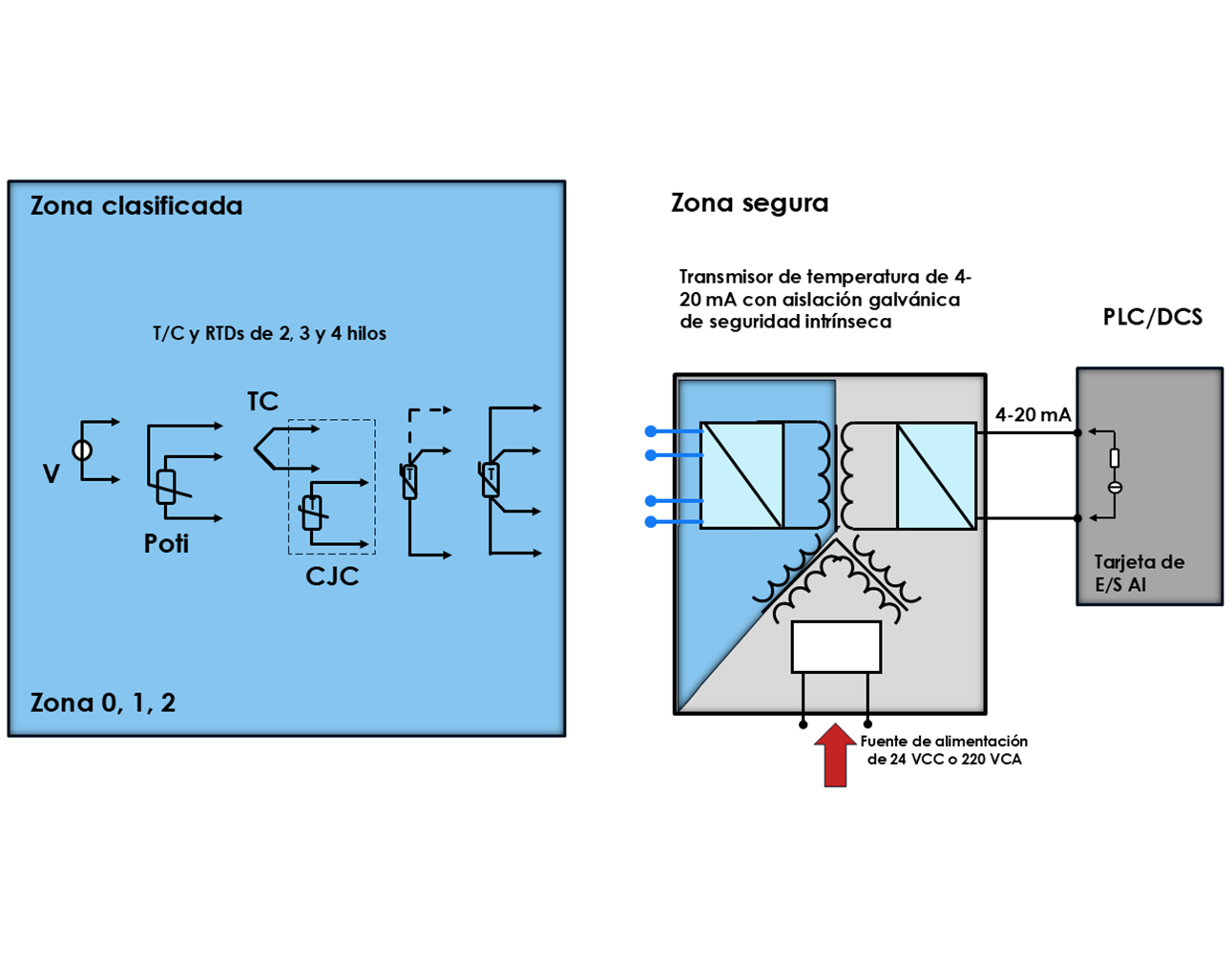 Para estas aplicaciones, los transmisores montados en riel DIN pueden incluir un aislamiento galvánico de seguridad intrínseca. Si este es el caso, no se requieren barreras adicionales.