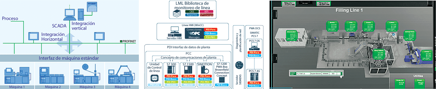 A nivel de las máquinas, el concepto incluye la estandarización de hardware y software basados en TIA (automatización totalmente integrada). La arquitectura de las máquinas se basa en comunicación Ethernet utilizando Profinet y OPC UA, y los datos de operación y estado de las máquinas se configuran siguiendo estándares internacionales como OMAC y Weihenstephan.