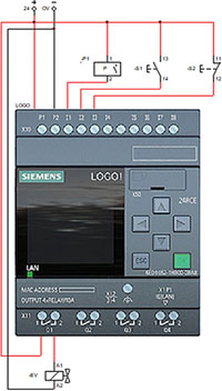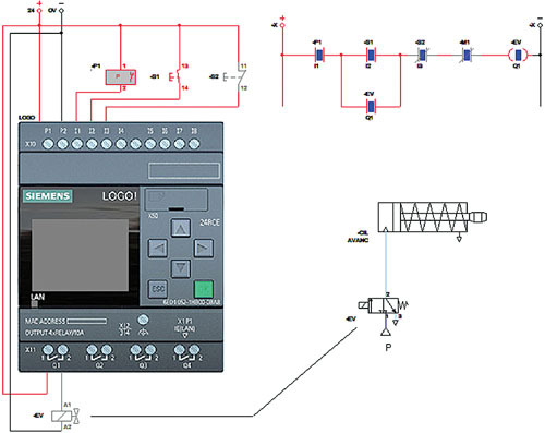 Ya sabiendo que la electroválvula debe accionarse para avanzar el cargador, se determina que esta no está accionada. Se observa que la salida Q1 del PLC está en cero (‘LOW’), por lo tanto no hay tensión que active el solenoide de electroválvula. Como se trata de un automatismo con PLC, se analiza el segmento ladder impreso y se observa que, en la línea de potencial hacia la salida de avance cargador, hay tres componentes, una marca y la retención en paralelo al pulsador de marcha y son los siguientes (ver figura 2): P1 (presostato general neumático), S1 (pulsador de avance), S2 (pulsador de retorno), M1 (máquina ciclando, que depende de otro sector del programa).
