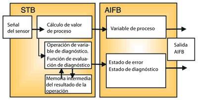 Figura 1. Ejemplo de configuración de funciones de diagnóstico para un instrumento de campoConfiguración de funciones de diagnóstico para instrumentos de campoLos buses de campo Foundation se aplican a las tecnologías de diagnóstico de las plantas. La figura 1 muestra la configuración de las funciones de diagnóstico dentro de un instrumento de campo. Las funciones de diagnóstico se implementan en el bloque de transductor del sensor (STB, Sensor Transducer Block) y los resultados de diagnóstico se pasan como una señal de estado hacia un bloque de función de entrada analógica (AIFB, Analog Input Function Block). En el STB, las variables a diagnósticar se obtienen por un cálculo basado en los valores de proceso medidos para caudal, presión, temperatura, y demás, y se realizan operaciones lógicas para el diagnóstico. Los resultados de diagnóstico se transmiten como señales de alarma a una computadora y su utilizan para dar soporte al plan general de mantenimiento. Aplicaciones y tecnologías analíticas de diagnóstico