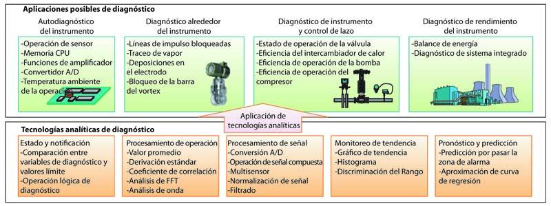 Figura 2. Aplicaciones y tecnologías de diagnóstico analíticoUn instrumento de campo es responsable de medir el valor físico y la composición química de los elementos en una planta, tales como temperatura, presión, caudal, acidez y concentración, y para proveer la información de medición al sistema de control de la planta. Se requiere un instrumento de campo equipado con funciones de comunicación digitales, tales como bus de campo, para proveer muchas de las funciones que se muestran en la figura 2, además de las precisión y rango de medición, la resistencia ambiental o el costo de la eficiencia. Específicamente, los usuarios requieren que un instrumento de campo para proveer soporte al mantenimiento y seguridad de las operaciones de planta, que provea información basada en los resultados de auto diagnóstico del propio instrumento, del campo a su alrededor, del equipamiento, del lazo de control, y cosas similares. Es necesario obtener información de diagnóstico basada en la información multifuncional de los transmisores de bus de campo existentes, en lugar de instalar nuevos sensores. Algoritmos de diagnóstico