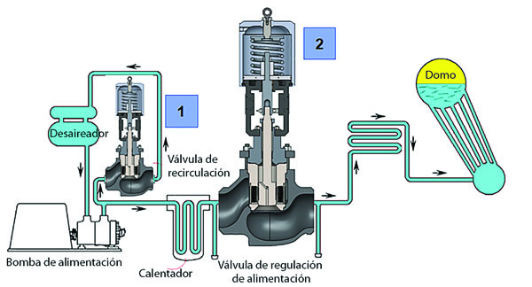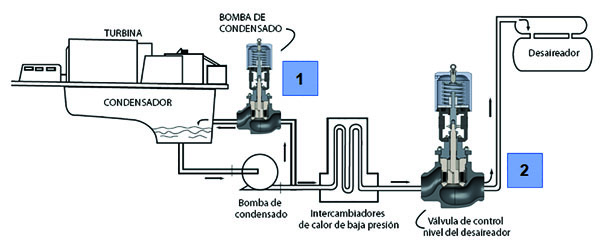 • Válvulas utilizadas: es usual que la bomba de condensado requiera una recirculación de caudal (1) mínima para prevenir sobrecalentamiento o cavitación. Las bombas envían normalmente entre 300 a 600 libras por pulgada cuadrada (aproximadamente 20 a 40 bar-rel) a 40-60 grados centígrados mientras que se descarga a muy baja presión o vacío. Estas válvulas pueden estar sometidas a cavitación severa y deben tener buen cierre si no están demandadas a actuar, para mantener la eficiencia de la bomba. El control de nivel del desaireador (2) es otro punto crítico, requiere buena rangeabilidad, buen control a bajos caudales y tolerancia a aumentos bruscos de caudal