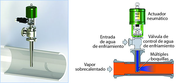 • Válvulas utilizadas: 1) y 2) control de presión del domo y de presión en la turbina; 3) bypass y atemperamiento en baja carga; 4) válvula de bypass al recalentador; 5) y 6) válvula de bypass de turbinas. Las válvulas que realizan bypass pueden trabajar con caídas de presión desde bajas a medias-altas y pueden, en algunos casos, requerir usarse en combinación con atemperadores para controlar la temperatura del vapor.