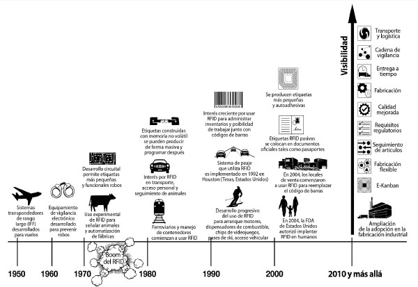 La identificación automática, tanto RFID como código de barras, ha tenido uso comercial desde comienzos de los ‘70. Los primeros códigos de barras se utilizaron para identificar productos en el entorno de venta al por menor, mientras que RFID se utilizaba para prevenir el robo, control de accesos e identificación de ganado. A la vez que esos métodos aún se utilizan al día de hoy, se han desarrollado más aplicaciones desde entonces. La tecnología se ha refinado y la información es más confiable, lo que resulta en un incremento en la calidad y procesos menos complejos. Las corporaciones públicas y privadas, pequeñas y medianas empresas, y los gobiernos en todo el mundo han concluido que las tecnologías RFID y de código de barras son capaces de proveer la visión necesaria dentro de sus procesos. Estas organizaciones diversas, por ingresos y aplicación, han probado que los beneficios de RFID son cuantificables. Además, las investigaciones recientes indican que la demanda para implementar programas de trazabilidad es alta. En un estudio reciente de ABI Research [1] “El mercado para transpondedores, lectores, software y servicios RFID generará 70,5 billones de dólares desde 2012 hasta fin de 2017. El mercado fue impulsado por un crecimiento de novecientos millones de dólares (US$ 900.000.000) en 2011 y se espera y se espera que crezca un veinte por ciento (20%) por año. Los gobiernos, la venta al por menor, y la logística y transporte fueron identificados como los sectores más valiosos; juntos suman un sesenta por ciento (60%) de ingresos acumulados para los próximos cinco años”. La cantidad de aplicaciones que utilizan la tecnología RFID está creciendo rápidamente. El crecimiento pasado y proyectado indica que la tecnología está reconociendo las necesidades de múltiples sectores de la industria en todo el mundo. Desde una perspectiva de control de inventario, muchas organizaciones tienen objetivos similares. Los resultados en el sector de venta al por menor deberían esperarse también para la fabricación. “El crecimiento en la venta minorista se debe a los beneficios probados que puede ofrecer el etiquetado por ítem. Es menos probable perder el stock, los negocios están mejor provistos, y los procesos de compra son más inteligentes”. Los productores también deben recibir beneficios. “La logística y el transporte hacen uso cada vez más de la posibilidad de hacer un seguimiento de los bienes ya sea por pallets, por contenedor o por ítem puesto que los proveedores de servicios buscan generar información más detallada para sí mismos y sus clientes”. La fase de prueba de estas tecnologías ha pasado hace mucho tiempo. A la vez que los entornos industriales varían enormemente, tanto el código de barras como el RFID han evolucionado de forma inteligente para integrarse en cualquier operación.