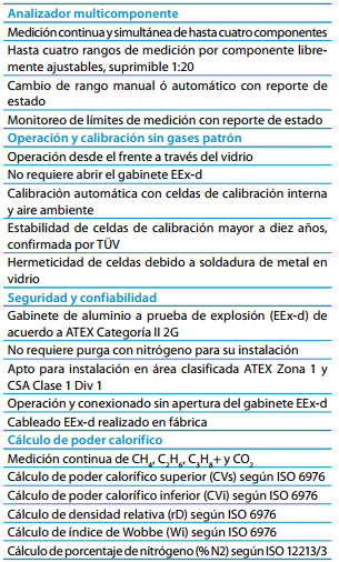 Las principales ventajas de medir con un equipo NDIR se encuentran en las características propias del analizador EL3060-Uras26. Dicho equipo puede medir hasta cuatro componentes diferentes en simultáneo, con hasta cuatro rangos de medición para cada componente. Detectores rellenos de gas son utilizados en este analizador, resultando en una alta selectividad a los componentes analizados así como límites de detección extremadamente bajos. La medición se realiza en tiempo real con un T90 de cinco segundos, lo cual representa una ventaja considerable frente al tiempo de ciclo de análisis de un cromatógrafo (cinco a diez minutos). El cálculo de los parámetros se realiza también en tiempo real, ya que las ecuaciones de la norma ISO 6976 se encuentran incorporadas al software del analizador. Todos los componentes medidos y valores calculados se presentan en pantalla y están también disponibles como señales de cuatro a veinte miliampers (4-20 mA), Modbus o Profibus. Respecto a gases de servicio, el equipo EL3060-Uras26 no los requiere. Al no tratarse de un cromatógrafo, no es necesario un gas carrier para transportar la muestra a través de las celdas de medición; solamente es necesario regular caudal y presión de la muestra a analizar previo al ingreso al equipo. Para ello es suficiente con un regulador de presión y un rotámetro. Asimismo, no se requieren gases de calibración para la operación normal, ya que el equipo posee celdas internas para calibración de span, mientras que el cero se puede calibrar con aire ambiente o nitrógeno. Dicha calibración se puede programar para iniciarse regularmente de forma automática, lo cual se traduce en ahorro de tiempo y dinero en rutinas de mantenimiento. Este analizador posee un gabinete construido totalmente en aluminio a prueba de explosión (EEx-d) apto para instalación en área clasificada ATEX Zona 1 o Clase 1 Div 1, y no requiere purga con nitrógeno para cumplir con dicha certificación. La unidad electrónica se encuentra ubicada dentro de un gabinete con pantalla protegida por vidrio a prueba de explosión, mientras que el fotómetro NDIR se ubica en un gabinete contiguo y está conectado al primero mediante cableado a prueba de explosión. Todas las conexiones EEx-d se realizan en fábrica, sin necesidad de que el usuario las intervenga. Una caja de conexiones de seguridad aumentada (EEx-e) se provee adosada al equipo para realizar el conexionado eléctrico y de señales. La operación es, asimismo, sencilla, directamente desde la pantalla táctil a través del vidrio, sin puntero magnético. Las características son resumidas en la siguiente tabla: