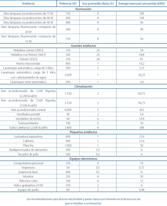 A título orientativo, le presentamos a continuación la potencia promedio en watts de algunos de los aparatos o artefactos electrodomésticos de mayor uso en nuestros hogares, el tiempo promedio estimado de uso diario de cada uno de ellos medido en horas, y consecuentemente, el consumo de electricidad mensual asociado medido en kilowatt-hora (kWh).