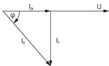 Si la potencia en watts se divide por la tensión en volts, obtenemos el cos φ, o sea, la corriente activa o la componente real de la corriente del sistema.