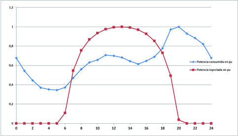 El perfil típico diario de generación solar asume la forma de la densidad de radiación solar captada, presentando su valor máximo en las primeras horas de la tarde, desplazado de la demanda residencial máxima. En la figura (1) se observa la curva unitaria de generación junto con la de demanda, poniendo en evidencia que, según el nivel de penetración de la generación solar, el flujo de potencia puede invertirse.
