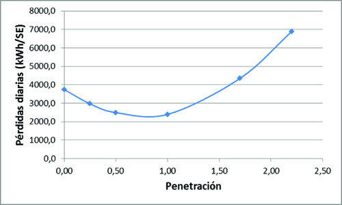 Por otra parte, se pudieron evaluar las pérdidas de energía diaria totales por nivel de penetración. Los valores se exhiben en la siguiente gráfica.