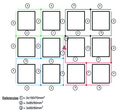 A efectos de estudiar el impacto de la GD con PFV en la tensión con una mejor aproximación a las redes reales que en el estudio simplificado antes expuesto, se desarrolló un modelo representativo de una red de distribución aérea de MT y de BT típica de un área de 2 MW/km2 de densidad de demanda, figuras 2a y 2b al final del trabajo. Se adoptó una línea aérea de MT 3x95/15 Al/Aº, con 12 CT MT/BT de 500 kVA equiespaciados a 500 m. Para la red de BT se adoptó un trazado típico de una línea por calle siguiendo la urbanización en damero con cuatro circuitos por CT como se observa en el esquema, considerando puntos de derivación de consumo o inyección en nodos uniformemente distribuidos, representativos de los puntos en que se ejecutan las derivaciones de línea a usuarios (estructuras de línea BT). Las líneas de BT son de tipo preensamblado, y las secciones se indican en la figura correspondiente. Conforme los usuarios previstos, los transformadores de MT/BT resultan cargados al 80% en el momento de máxima carga.