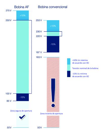 Los contactores convencionales trabajan dentro de un rango de tensión de bobina determinado y por norma deben garantizar su correcta operación incluso con una tensión 10% superior a la nominal o 15% inferior a esta. Fuera de ese rango, existe una zona de incertidumbre en donde no está garantizada la correcta operación del contactor. Justamente en esa zona es donde se produce el “zapateo”. La tecnología AF brinda un rango amplio de operación muy superior al que maneja cualquier contactor convencional, además de cumplir con los porcentajes de sobre- y subtensión exigidos por la norma pero más allá de eso lo que cabe destacar es que incluso por debajo de su rango mínimo de operación no existe tal zona de incertidumbre. El contactor AF nunca “zapatea”. Cuando la tensión baja de su mínimo nivel de sostenimiento, el contactor realiza una apertura franca y controlada sin ningún tipo de oscilación, lo que asegura una mayor confiabilidad del producto y una vida útil mucho más extendida.