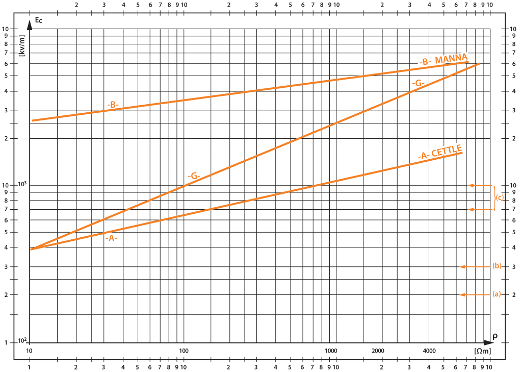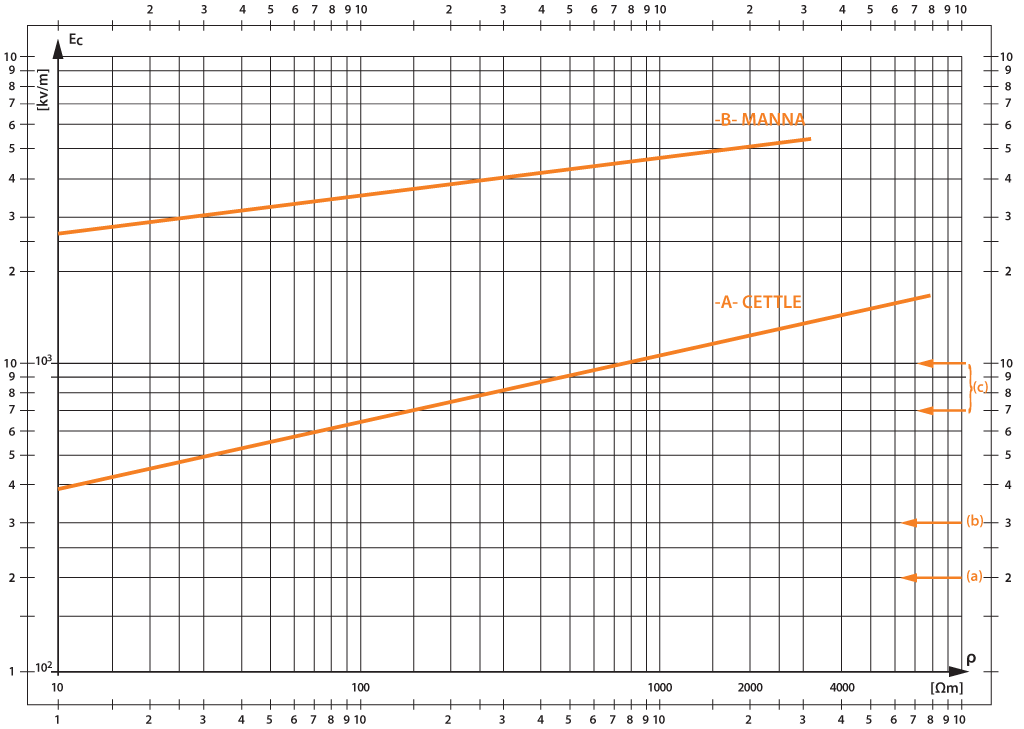 Figura 6. Nomograma bilogarítmico de la función Ec (kVc/m) = a.ρb del campo eléctrico crítico de ionización del suelo alrededor de un electrodo de puesta a tierra en función de la resistividad volumétrica ρ (Ωm). Autor: Oettle (A). Manna (B)Línea: A, B | Valores: a, 241 y 1986 kVc/m; b, adimensional 0,215 y 0,124, y ρ, valor numérico (medida) de Ωm