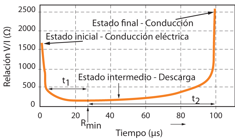 En la figura 2 se muestran unas curvas típicas del comportamiento del suelo ante impulsos de rayos y se destaca el comportamiento de la resistencia que presenta varios estados de disminución y de recuperación de la resistencia en el tiempo.