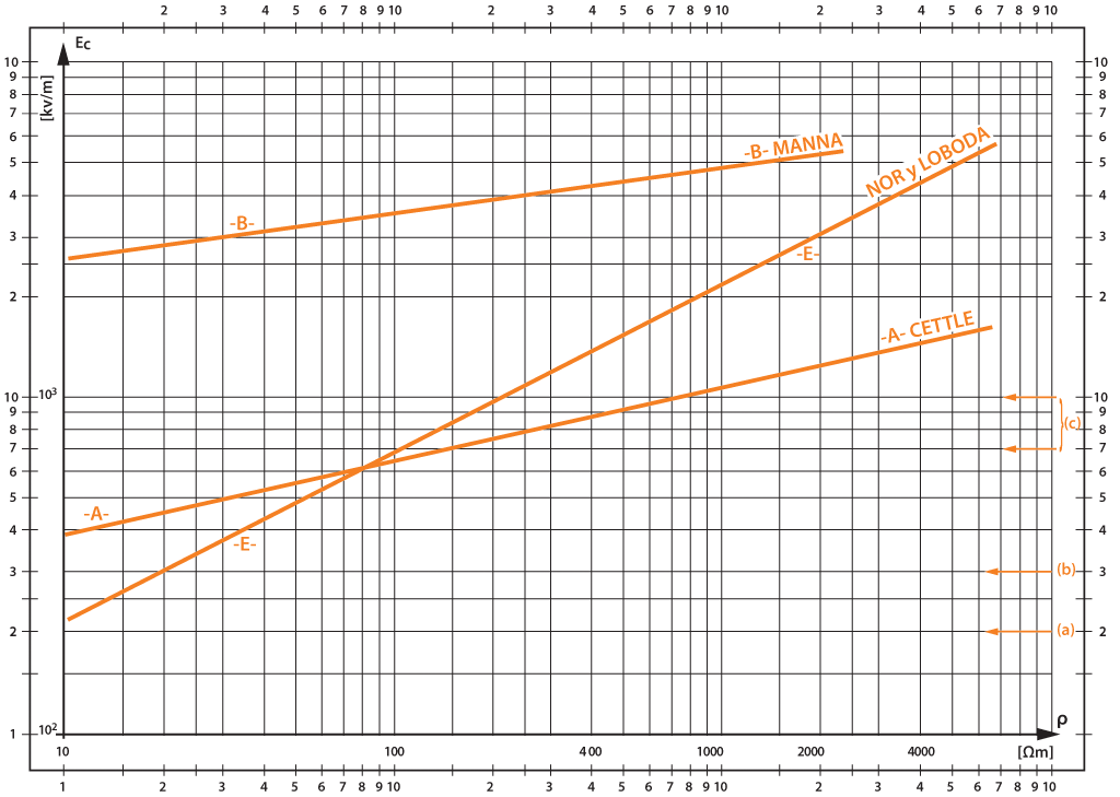 Figura 8. Nomograma bilogarítmico de la función Ec (kVc/m) = a.ρb del campo eléctrico crítico de ionización Ec del suelo alrededor de un electrodo de puesta a tierra en función de la resistividad volumétrica ρ (Ωm). Autores: Oettle, Manna, Nor, LobodaLínea: A, B, E | Valores: a, 241, 1986 y 68 kVc/m; b, adimensional 0,215, 0,214 y 0,5, y ρ, valor numérico (medida) de Ωm