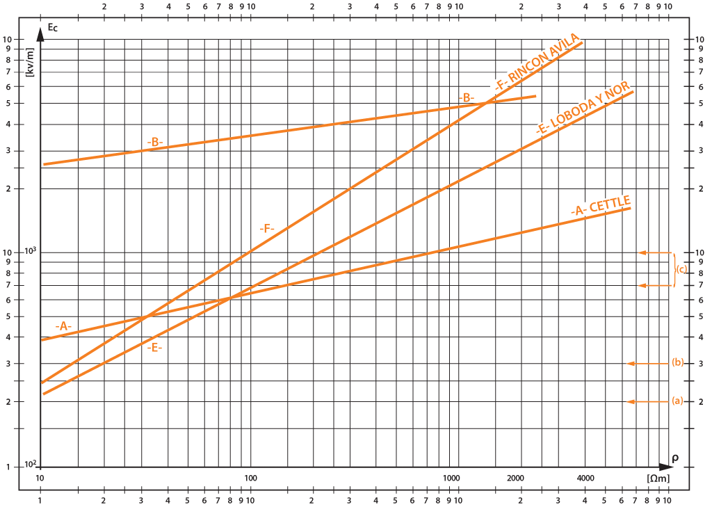 Figura 9. Nomograma bilogarítmico de la función Ec (kVc/m) = a.ρb del campo eléctrico crítico de ionización Ec del suelo alrededor de un electrodo de puesta a tierra en función de la resistividad volumétrica ρ (Ωm). Autores: Oettle, Manna, Nor, Loboda, Rincón ÁvilaLínea: A, B, E, F | Valores: a, 241, 1986, 68 y 59,8 kVc/m; b, adimensional 0,215 y 0,124, y ρ, valor numérico (medida) de Ωm.