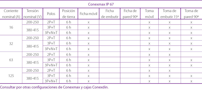 Las fichas y tomas industriales son productos especialmente concebidos para la realización de conexiones en redes de baja tensión en la industria y aplicaciones similares. Estas condiciones de uso son consideradas como severas por las diversas circunstancias en que se producen: trato desmesurado, rangos de temperatura extremos, ambientes con diferentes grados de polución, en interior o intemperie. Conexmax, de Conextube, es el nombre de la familia de fichas, tomas y aplicaciones para realizar conexiones de gran seguridad en ámbitos industriales y similares. Se fabrica de acuerdo a la norma IEC 60309 con polímeros de ingeniería, componentes metálicos de conexión y conducción especiales y diseño cuidado. Se provee para tensiones de utilización de 230 y 440 Vca, en 16, 32, 63 y 125 A, y dos grados de protección: IP 44 e IP 67 para exteriores. La familia Conexmax está compuesta por una extensa variedad de productos para infinidad de aplicaciones: Fichas industriales móviles, de embutir, de pared, para 16, 32, 63 y 125 A en grados de protección IP 44 e IP 67, para redes monofásicas 200-250 V y 50 Hz y trifásicas de 380-415 V y 50 Hz.
