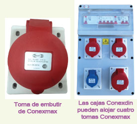 Esta nueva línea de fichas se complementa con las cajas de conexión y protección para uso industrial de montaje sobre superficies y móviles. Las nuevas cajas, llamada “Conexdin”, cuentan con grado de protección IP 65, y fueron desarrolladas especialmente para alojar tomas de embutir IP 44 e IP 67 de la familia Conexmax y otras marcas que se comercializan en el mercado. Pueden albergar en su interior cuatro tomas mono- o trifásicas de 16 y/o 32 A y protecciones en general (doce módulos DIN). El alto grado de estanqueidad asegura la protección necesaria para otorgar una larga vida útil a la instalación más allá de la agresividad del medio. Asimismo, cumplen con las exigencias del ENRE para primer seccionamiento, luego del medidor de electricidad. Conexdin, características técnicas